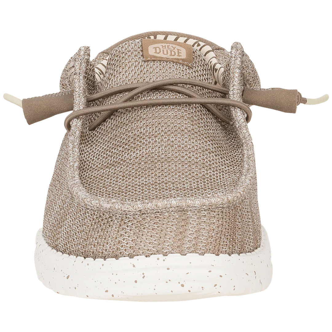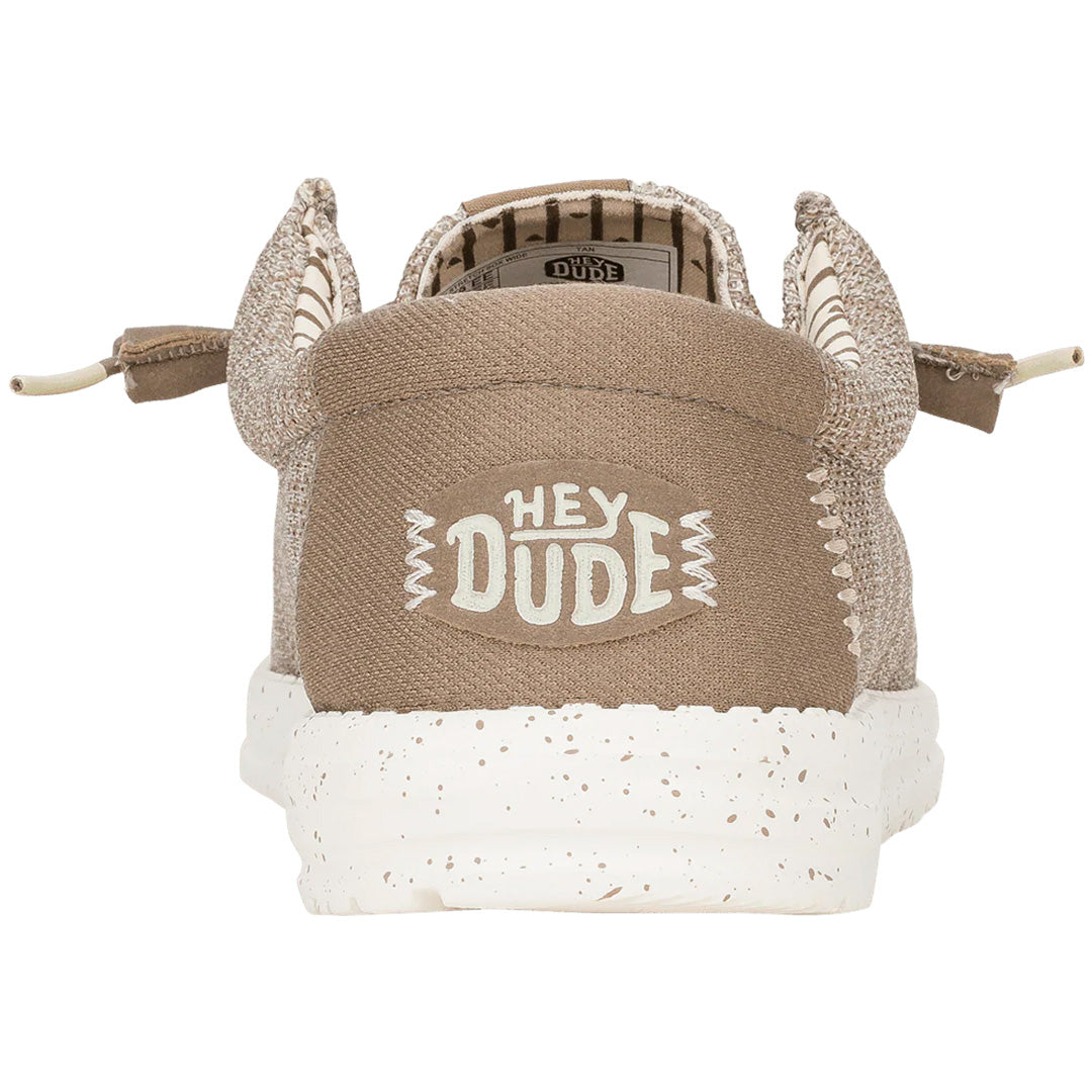 | Details: Slip-on casual shoe with stretch knit upper and easy-on system | Brand: Hey Dude lightweight, comfort-driven footwear | Fit: Relaxed fit with ample room for a laid-back, easygoing feel | Material: 100% polyester hand-selected stretch knit with woven cotton lining and printed graphic | Comfort: Cushy, removable foam insole with soft cotton lining for cloud-like, all-day cushioning | Design: Breezy mesh sock liner, speckled midsole, and tassels on laces | Outsole: Lightweight, flexible outsole for effortless movement | Use: Travel-ready shoe ideal for chill days, everyday wear, and life on the go | Care: Remove insole before cleaning; follow brand care instructions